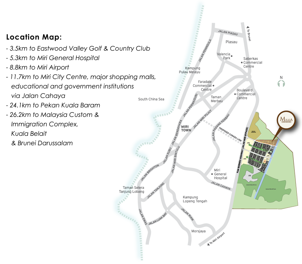 Milea Residences, an 89-acre development is located within the ParkCity Eastwood master-planned development. The project is strategically located at Miri East within a Gated & Guarded community which is approximately 7km to Miri Airport and approximately 8km to Miri City Centre. Moreover, this master plan is connected directly to Pan Borneo Highway, which links Sabah and Sarawak to Brunei.