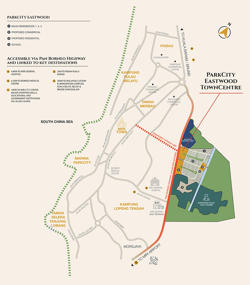 The township is directly linked to the main route of Pan Borneo Highway, connecting Sarawak, Sabah and Brunei. Thus, riding on the proposition of excellent connectivity, the development will comprise mixed commercial and residential projects with schools, parks and others.